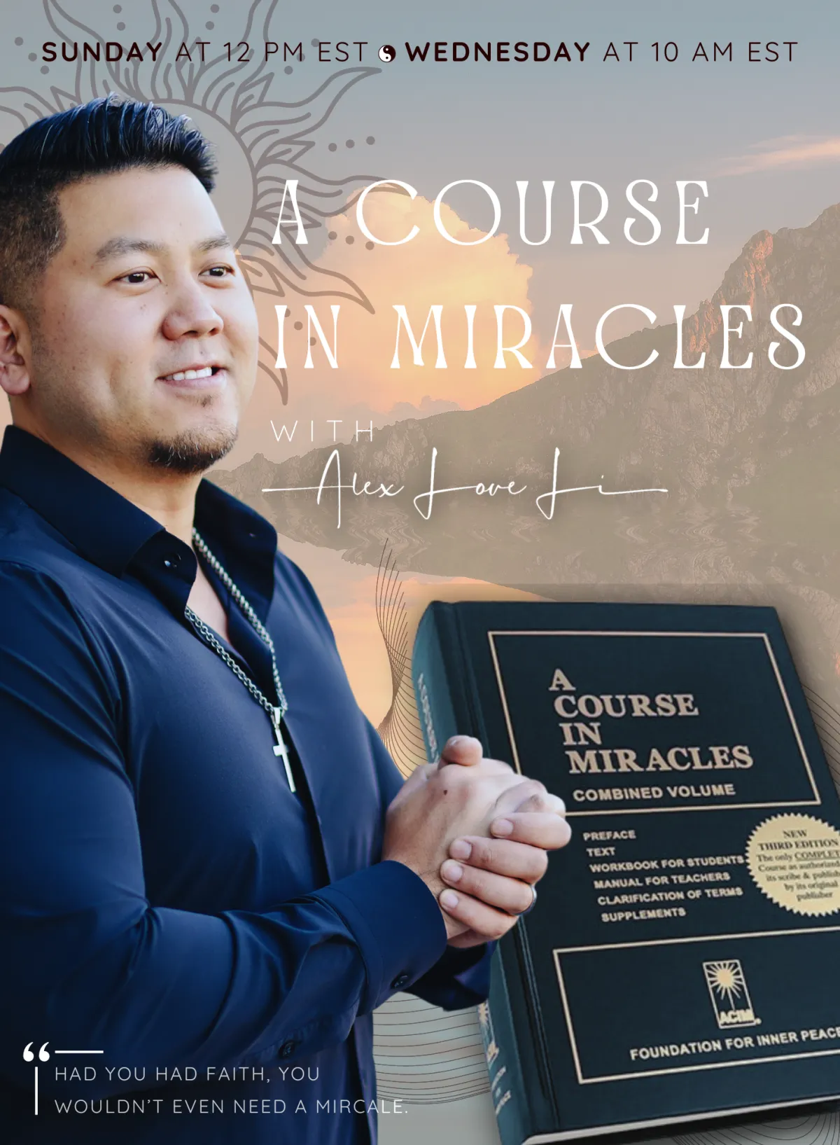 Every Sunday and Wednesday, we come together for 90 minutes of heart-centered connection. We read a chapter from A Course in Miracles, reflect, and engage in powerful conversations that help us embody its truths.
